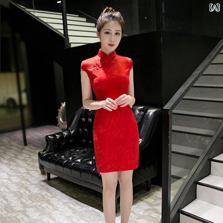 チャイナドレス レディース ワンピース 披露宴 結婚式 二次会 パーティー ドレス 花嫁 ウェディング レッド 赤 中国風 スリムフィット タイト ミニ丈 スタンドカラー 斜め合わせ ポリエステル 綿