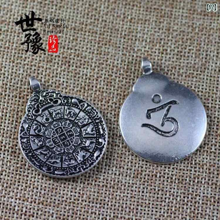 ペンダントトップ お守り 十二支 九宮八卦 蓮師 仏教 魔除け 開運 ラッキーアイテム 合金製 チベットスタイル 腰飾り 銅鏡モチーフ レトロ調 アンティーク風 ユニセックス 古金色 古銀色 | cybercart