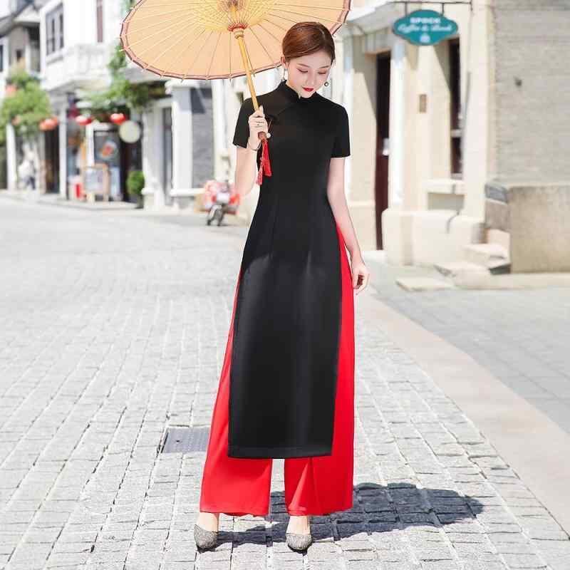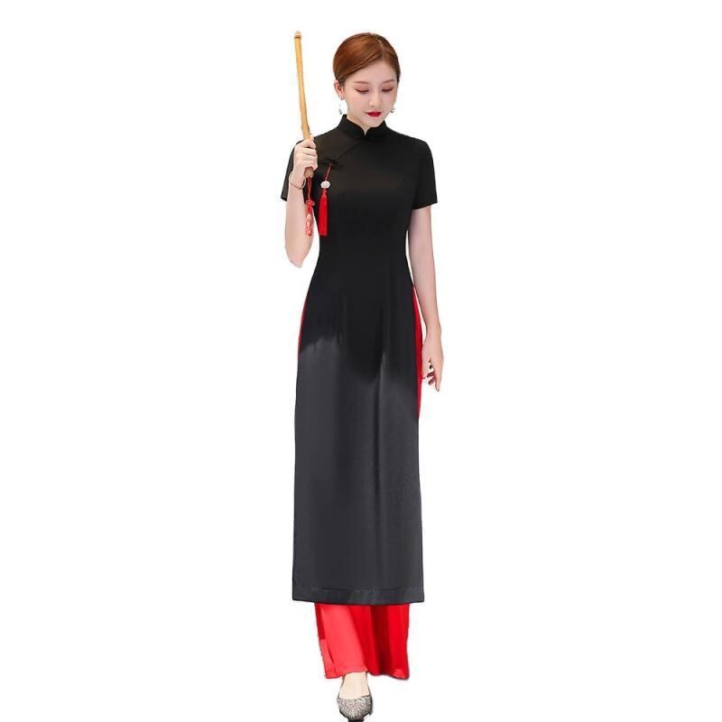 ワンピース レディース アオザイ チャイナドレス ロング丈 ワイドパンツ ツーピース セットアップ 立ち襟 スリット ビーズ装飾 ベトナム エレガント フォーマル パーティー 演奏会 ステージ衣装 ポリエステル アセテート ブラック レッド