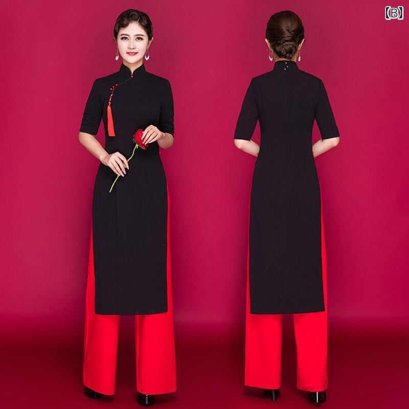 チャイナドレス レディース アオザイ ワイドパンツ セットアップ 舞台衣装 中国風 ベトナム風 シワになりにくい 伸縮性 ポリエステル 大人向け 演奏会 発表会 イベント ダンス フォーマル ブラック ホワイト ピンク ブルー エレガント 上品