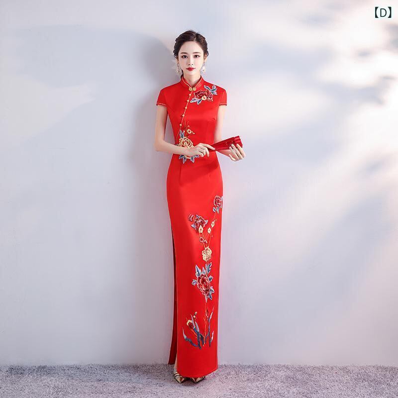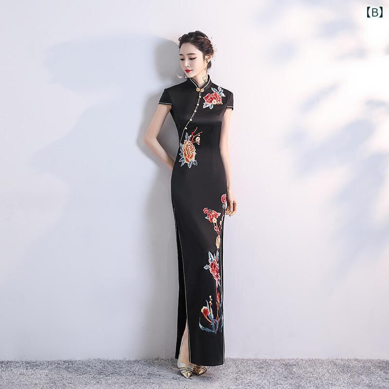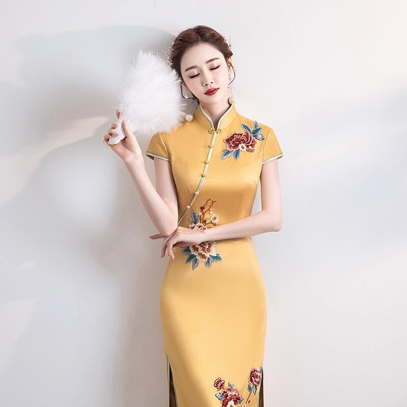 チーパオ レディース チャイナドレス スリムフィット 改良型 ハイ スリット ロング丈 ワンピース 舞台衣装 ステージ イベント 発表会 パーティードレス 大きいサイズ ポリエステル アセテート ホワイト ブラック レッド イエロー