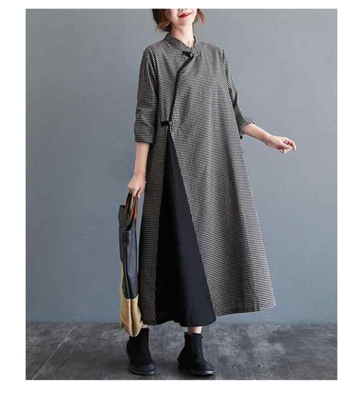 旗袍ワンピース レディース 大きいサイズ プラスサイズ ゆったり 体型カバー リラックスフィット チェック柄 盤扣 チャイナボタン レトロ クラシック 綿素材 コットン 立ち襟 スタンドカラー 普段使い カジュアル