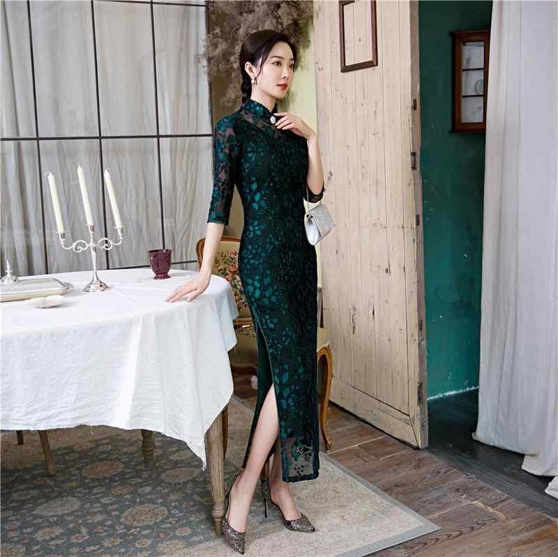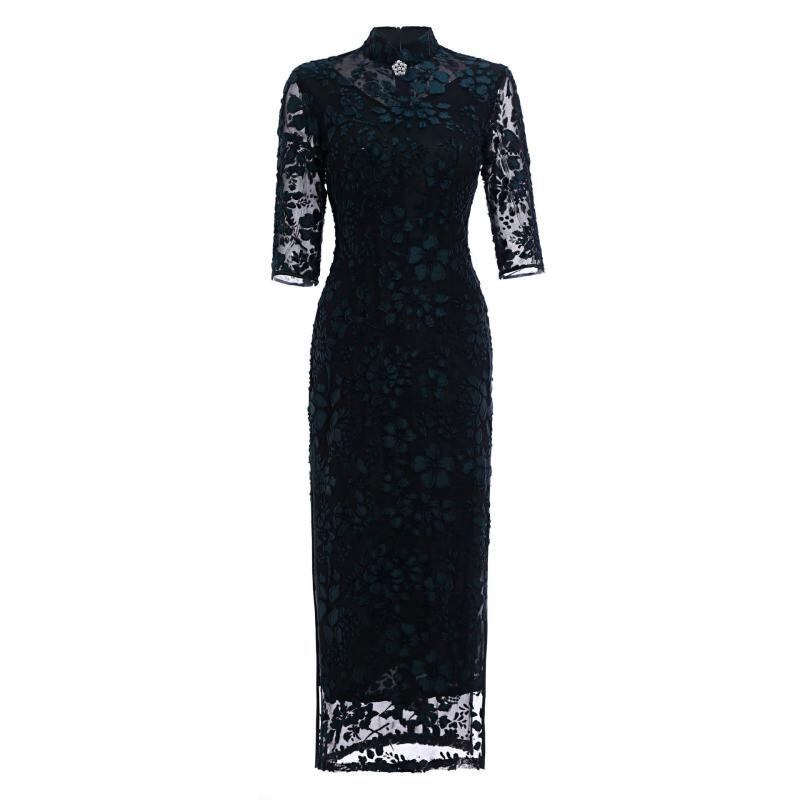 チャイナドレス レディース ロング丈 七分袖 フロッキー加工 スタンドカラー スリムフィット ワンピース 大きいサイズ 普段使い パーティー 発表会 レトロ クラシカル
