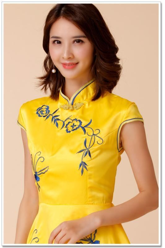 ワンピース レディース 新中華風 青花柄 刺繡 フォーマルドレス パーティードレス 宴会 発表会 舞台 大きいサイズ ショート丈 スタイルアップ 体型カバー ポリエステル サテン イエロー ブルー