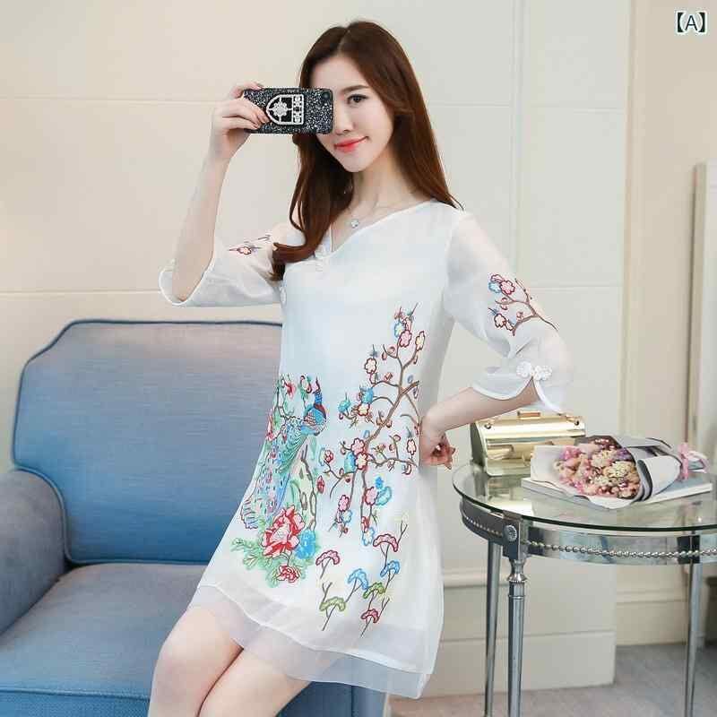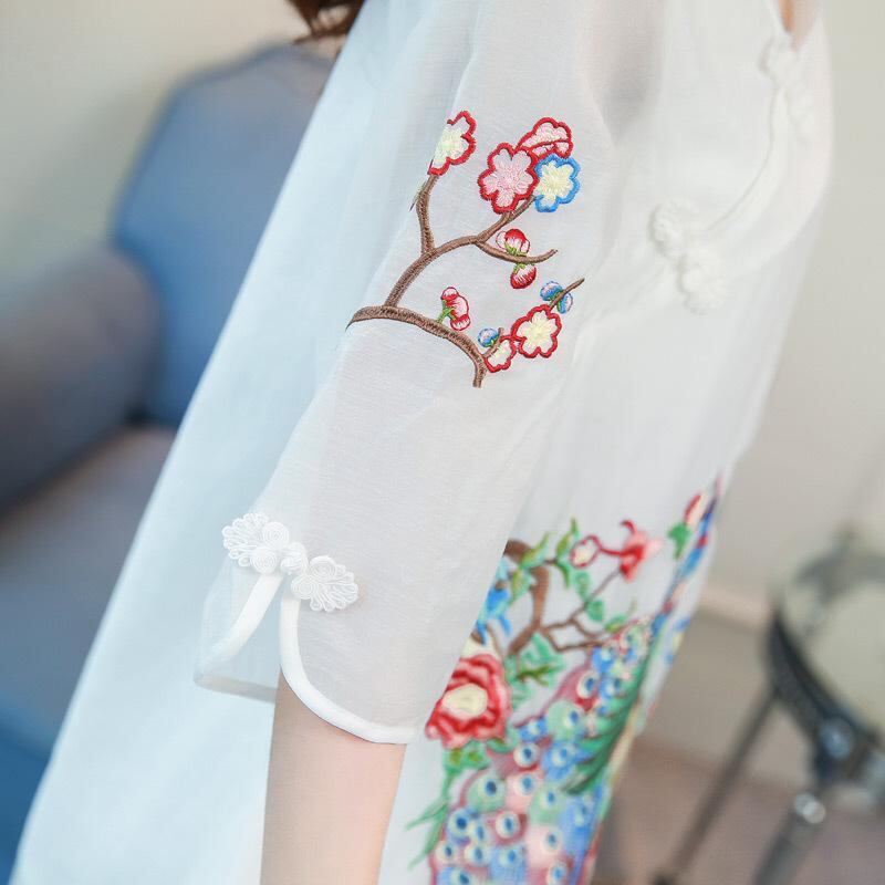 チャイナドレス レディース ローネック エレガント 刺繡 ゆったり 五分袖 大きいサイズ 改良デザイン ポリエステル ショート丈 斜め襟 ホワイト ブラック