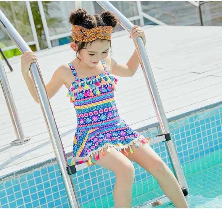 水着 スイムウェア キッズ 女の子 ベビー かわいい レトロ エスニック 民族風 花柄 ワンピース スカート付き 高伸縮 プール 海水浴 ビーチ 夏 ナイロン ポリエステル ブルー