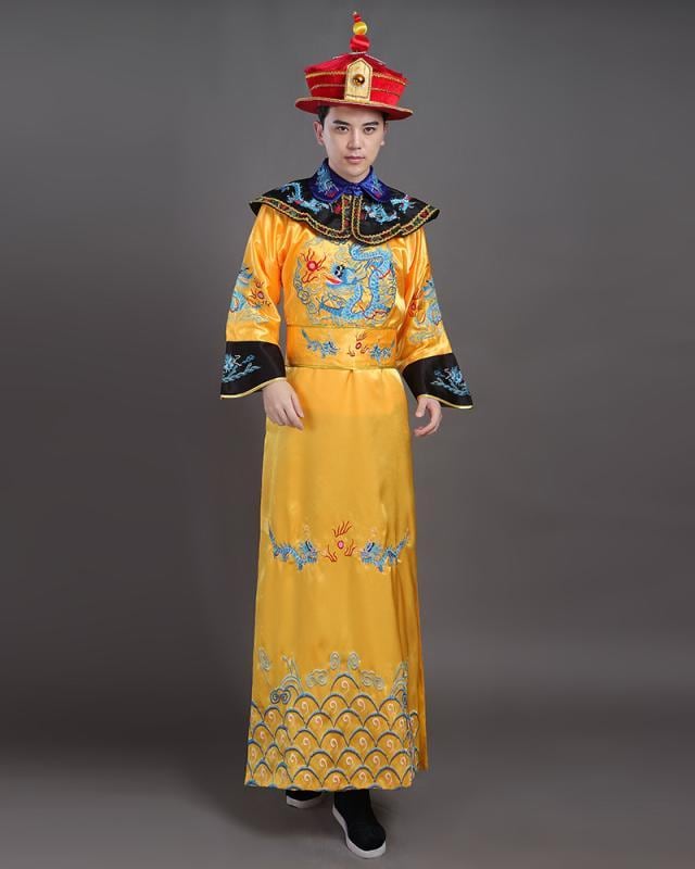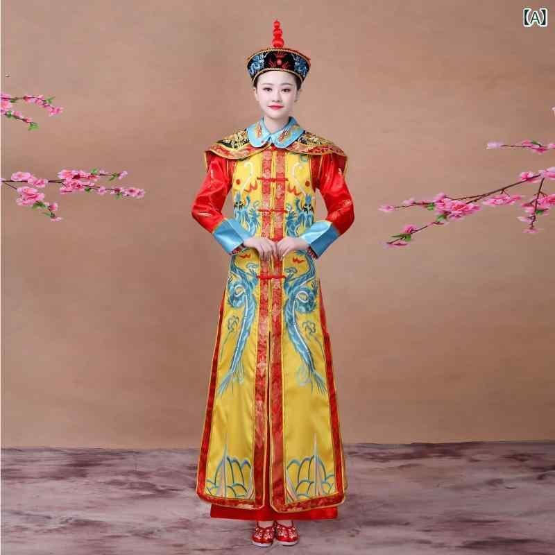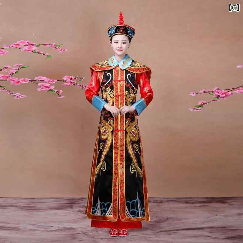 舞台衣装 男女兼用 中華風 宮廷衣装 皇帝 皇后 皇子 龍袍 鳳袍 成人 演劇 発表会 イベント コスプレ 仮装 なりきり サテン生地 ポリエステル 豪華 華やか 黄色 赤色 黒色 金色