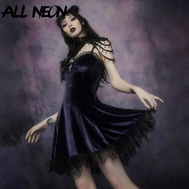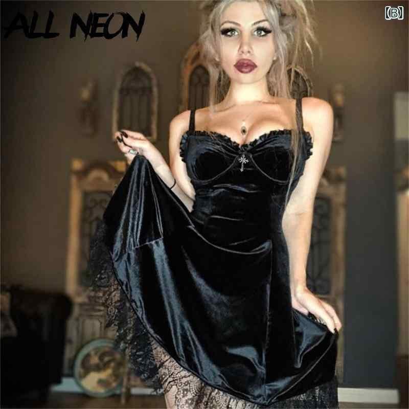 ワンピース レディース ダークゴシック セクシー デコルテ魅せ レース フリル キャミソール スリップドレス ミディ丈 ブラック パープル ポリエステル