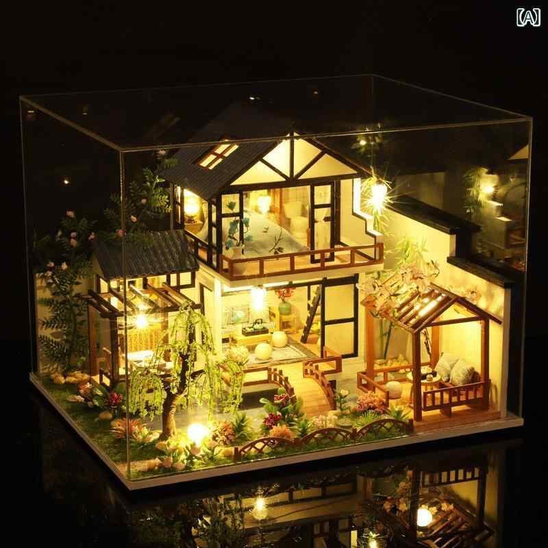 ミニチュアハウス 女性向け DIY 手作り 組み立てキット 中国風 建築模型 庭園 置物 オブジェ 誕生日 プレゼント ギフト 木製 ダストカバー付き 精巧 ホビー 大人向け 竹渓水苑