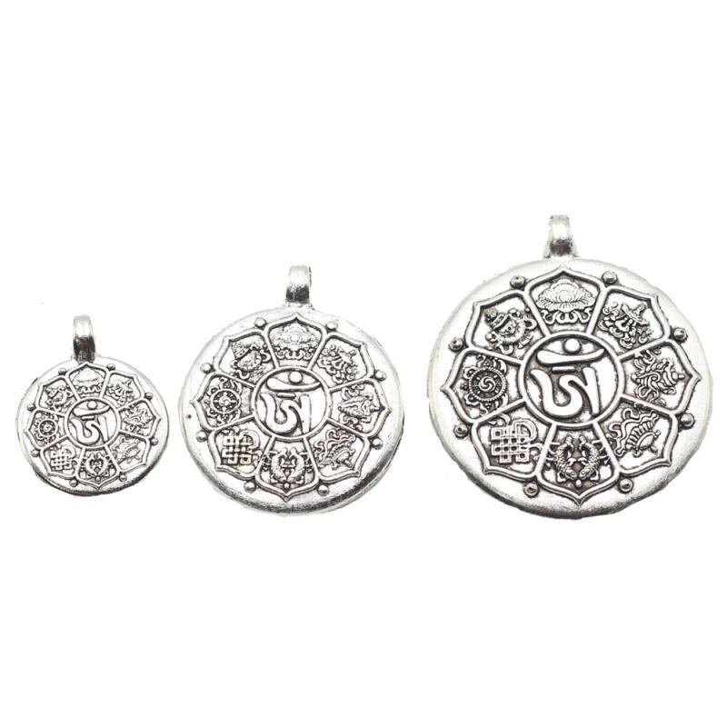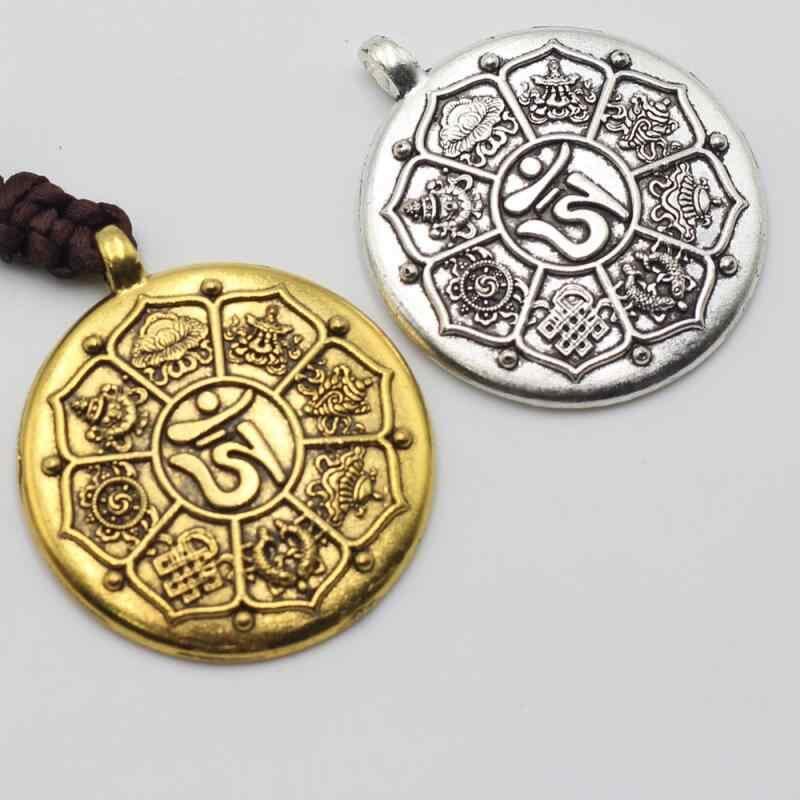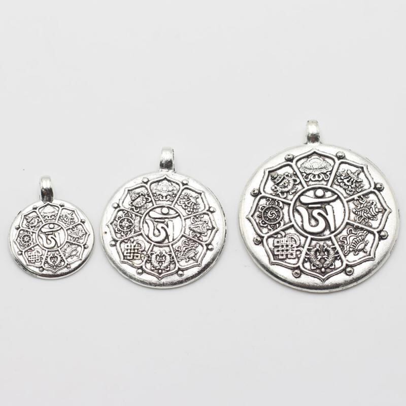 ペンダント 十二支 九宮八卦 八宝 菩提モチーフ 合金製 丸型 チベットシルバー風 古銀色 古金色 アンティーク調 民族風 レトロ ネックレス用チャーム ハンドメイドパーツ
