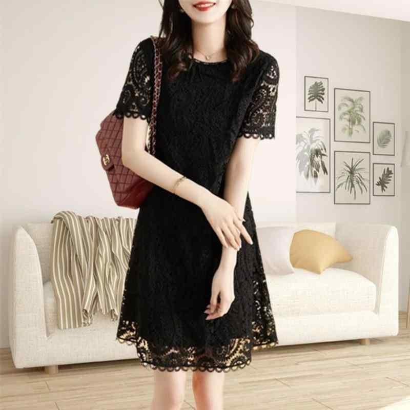 ワンピース レディース レース ミディ丈 半袖 Aライン フレア 夏用 低身長向け 体型カバー ラウンドネック 透かし編み シアー エレガント 上品 きれいめ オフィス 通勤 お呼ばれ ポリエステル 綿 ブラック ベージュ