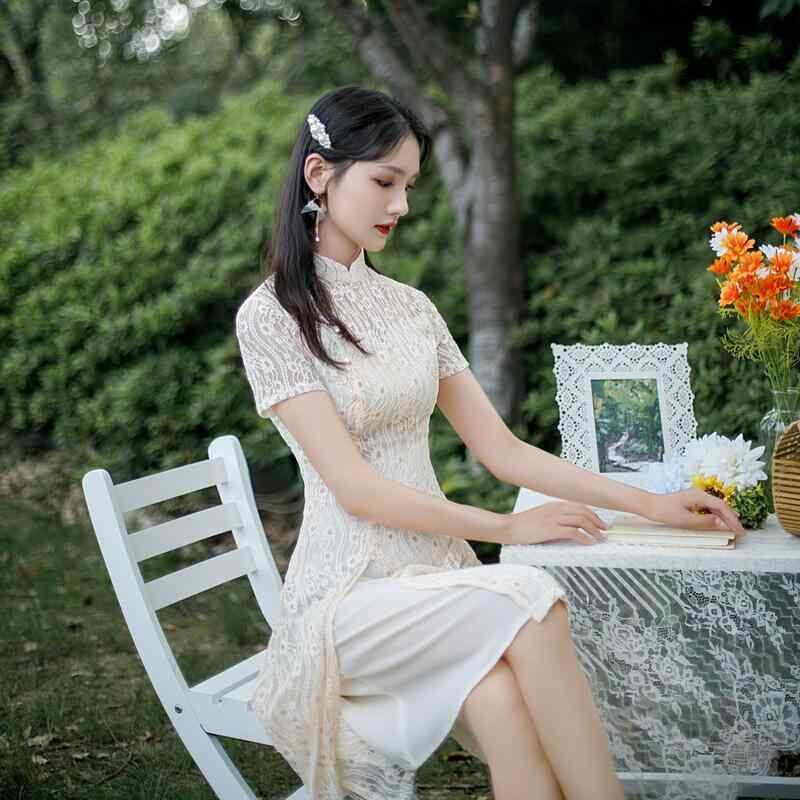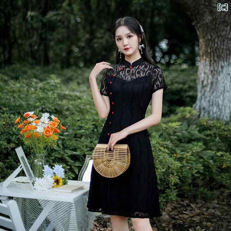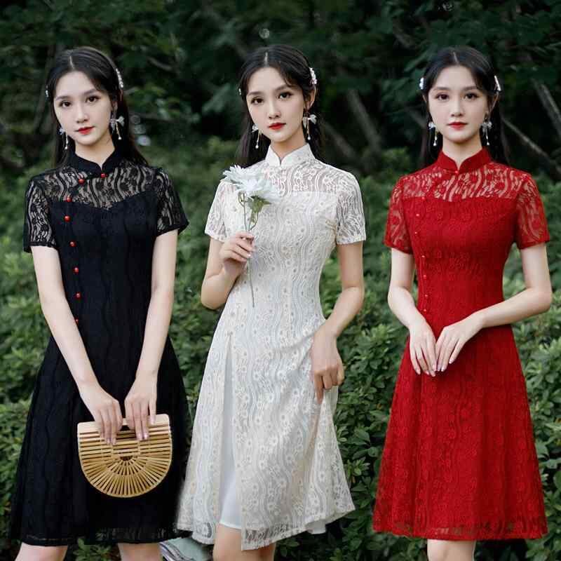 チャイナドレス レディース レッド 半袖 レース アオザイ レトロ 改良版 スリムフィット ミドル丈 花嫁衣装 ブライダル ウェディングドレス スタンドカラー ハイサイドスリット ポリエステル 伸縮性 エレガント