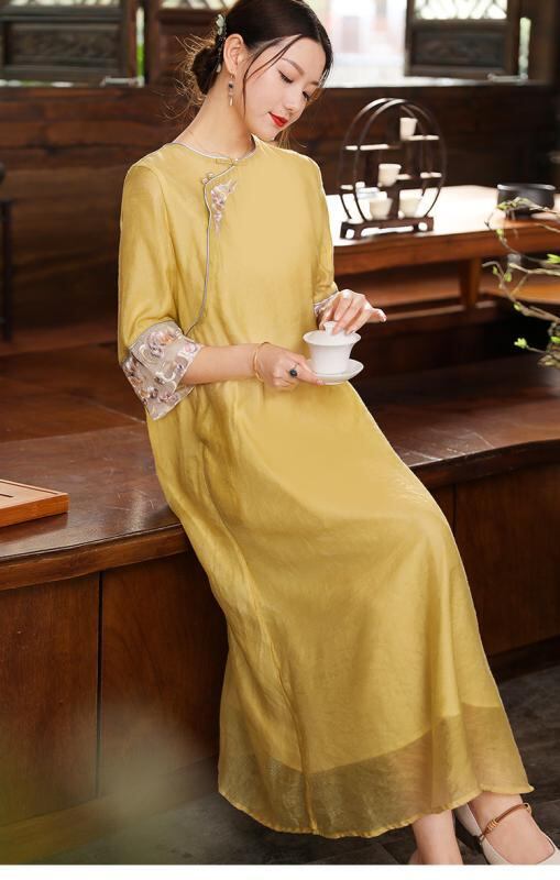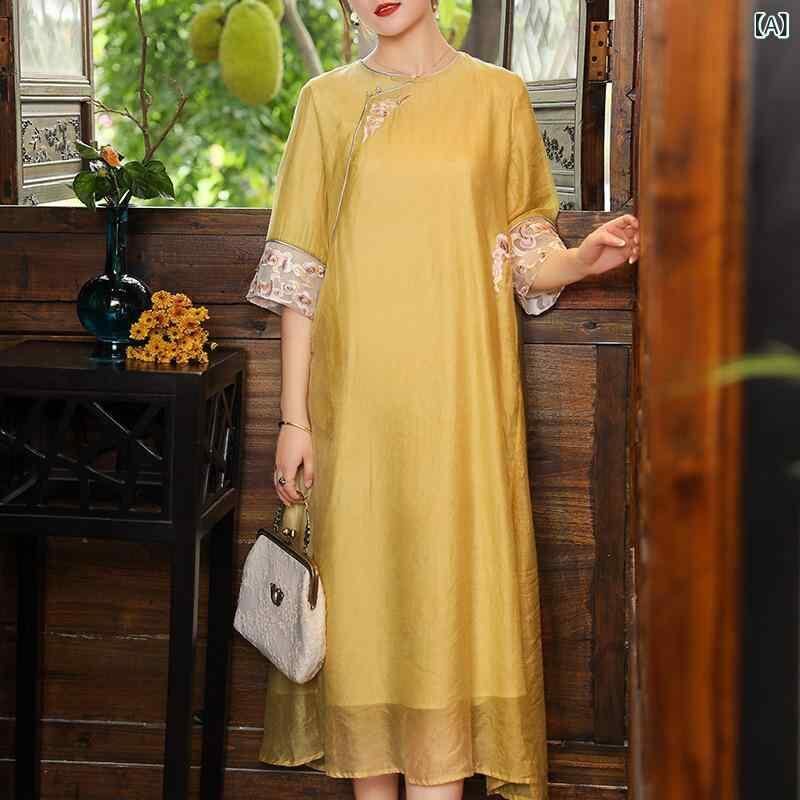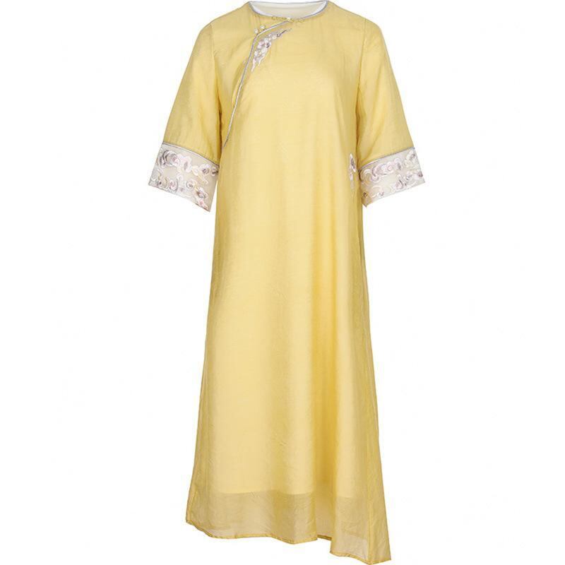 ワンピース レディース 中国風 宮廷風 レトロ ヴィンテージ 刺繍 テンセル素材 再生繊維 ラウンドネック Aライン ミモレ丈 七分袖 エレガント 上品 ゆったり お出かけ イエロー ラベンダー
