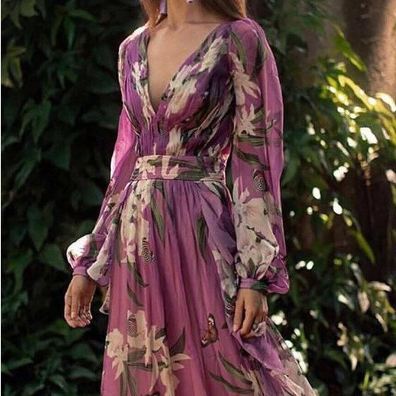 ワンピース レディース Vネック 長袖 ロング丈 シフォン プリント フレアデザイン エレガント 上品 通勤 オフィスカジュアル デイリー