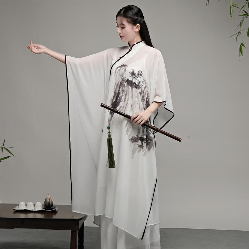 ワンピース ドレス レディース チャイナ風 エレガント 斜め合わせ 結びボタン チャイナボタン 立ち襟 ゆったり 大きいサイズ 体型カバー 山水画柄 茶服 禅服 瞑想 リラックスウェア 2点セット アンサンブル | cybercart