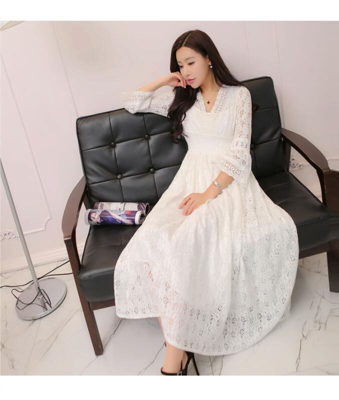 ワンピース レディース レース Vネック スリムフィット ウエストマーク 韓国ファッション リゾート ビーチ 花柄 かぎ針編み ミディ丈 Aライン フレア エレガント フェミニン 通勤 デイリー 体型カバー 白 アイボリー