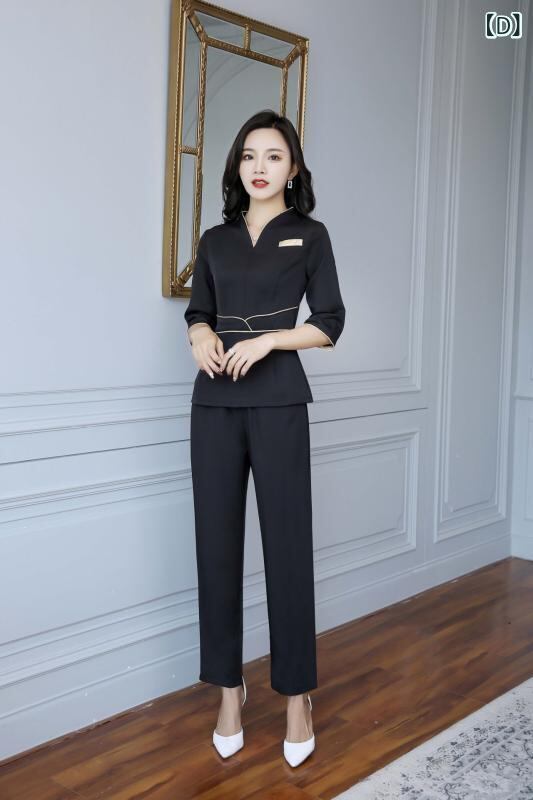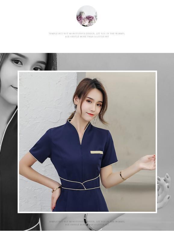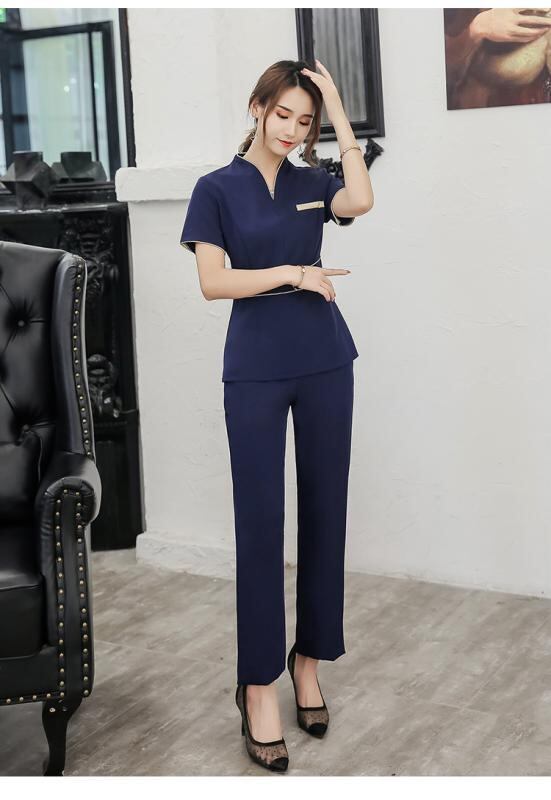 エステ ユニフォーム レディース サロン 美容院 足浴 施術着 仕事着 制服 吸湿速乾 ポリエステル Vネック 七分袖 半袖 セットアップ 上下セット ネイビー ブルー ブラック
