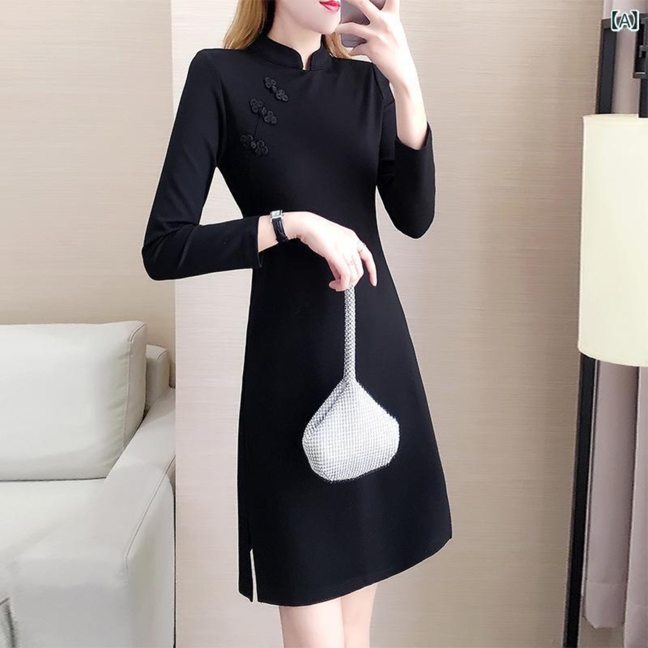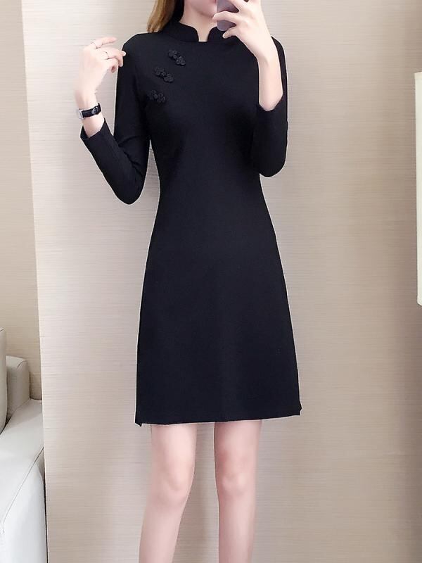チャイナドレス ワンピース レディース 大きいサイズ 秋物 レトロ ヴィンテージ スリムフィット 細見え フォーマル パーティー ステージ イベント ドレス 長袖 スタンドカラー ハイネック ミディ丈 エレガント 上品 綿 ビスコース ブラック