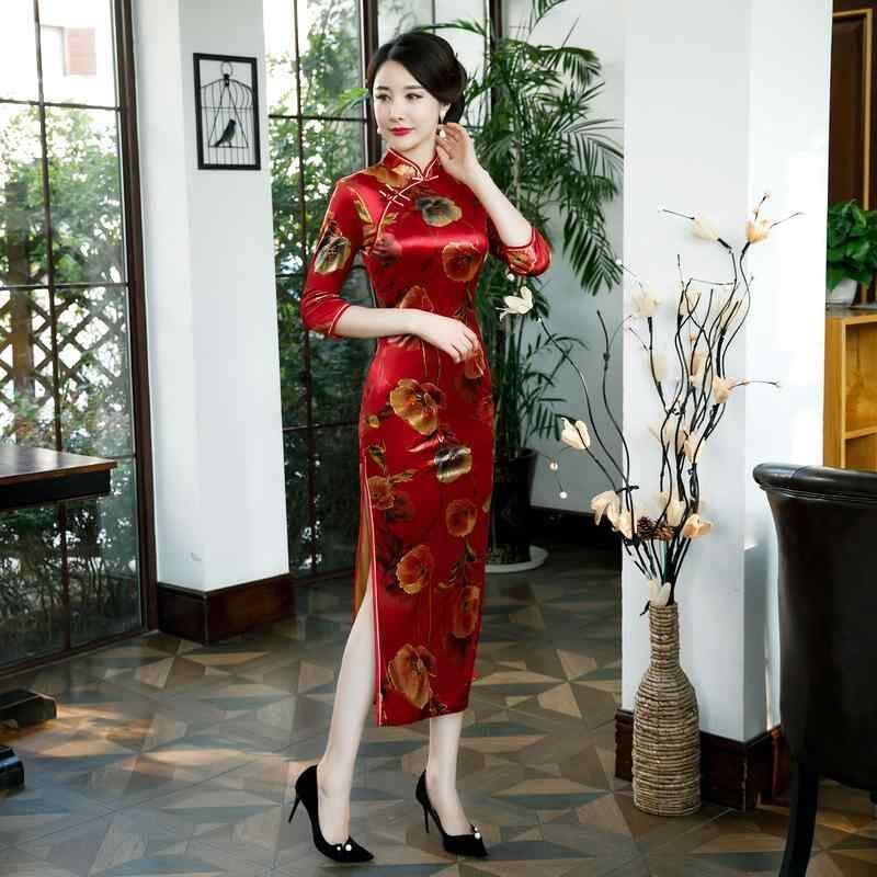 ・素材: ポリエステル100% (金糸ベルベット) ・スタイル: 中国風 ・テイスト: レトロ ・性別: 女性 ・丈: ロング ・ネックライン: スタンドカラー ・前合わせ: 斜め ・袖丈: 七分袖 ・袖タイプ: レギュラー ・スリット: ハイタイプ ・デザイン: 立体装飾 ・カラー: 金色の花模様(赤) ・サイズ展開: XL、XXL、XXXL、XXXXL、5XL