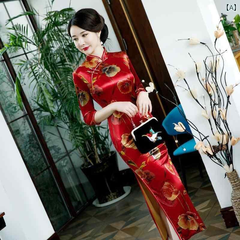 チャイナドレス レディース 改良型 ロング丈 ベルベット ポリエステル素材 エレガント スタンドカラー 斜め襟 七分袖 ハイウエストスリット 立体装飾 中国風 レトロ 舞台衣装 大きいサイズ レッド ゴールド花柄