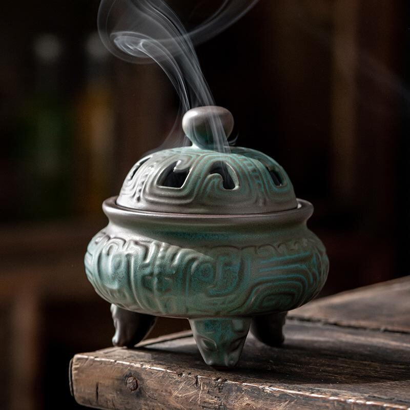 香炉 陶器製 三本足 アンティーク調 青銅風模様 室内用 渦巻き線香 白檀線香 仏壇 茶道 アロマ 置物 おしゃれ インテリア 手作り モダン中華風 癒し