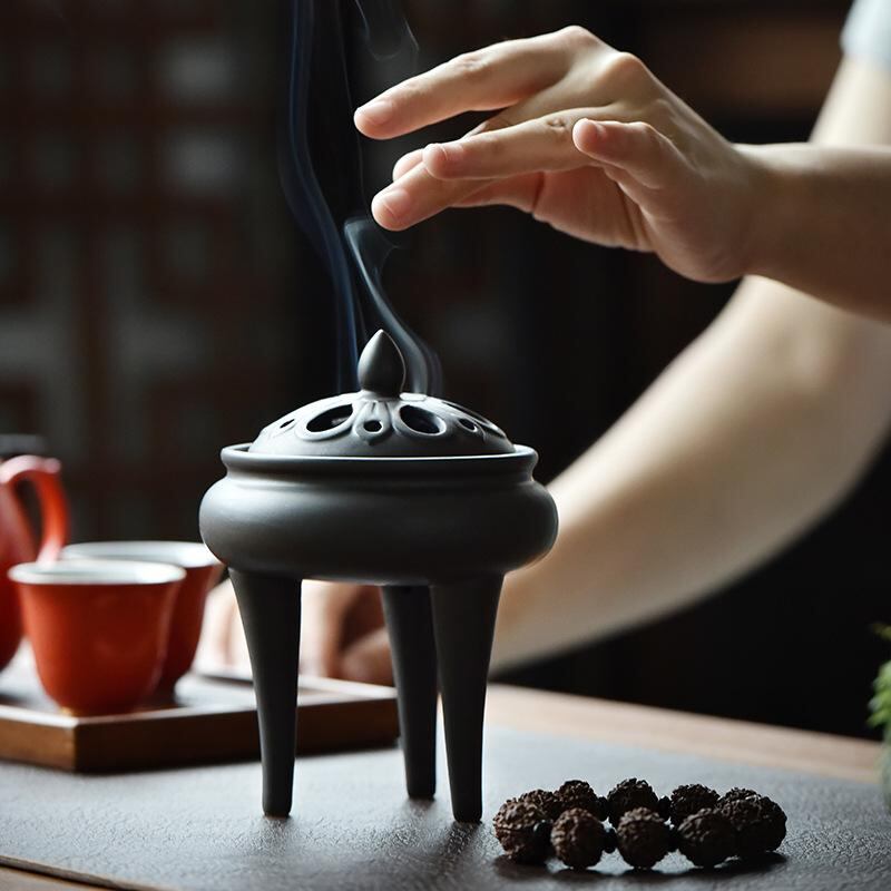 香炉 蓮の花 陶器製 高足 三足 脚付き 渦巻き線香 香立て 沈香 白檀 自宅用 室内 書斎 茶道用 リビング 寝室 玄関 和風 禅風 モダン インテリア 飾り 置物 癒し リラックス