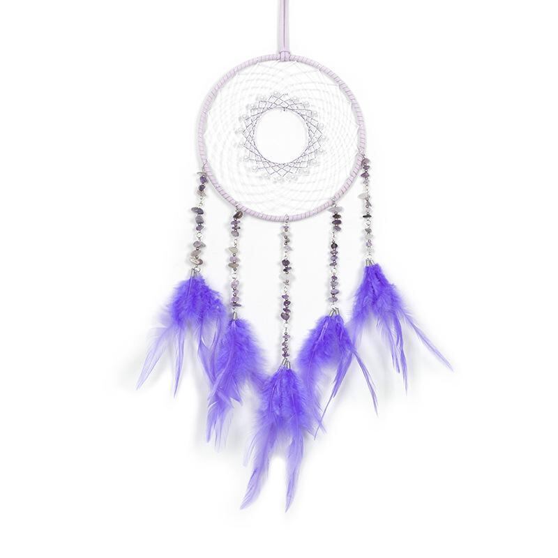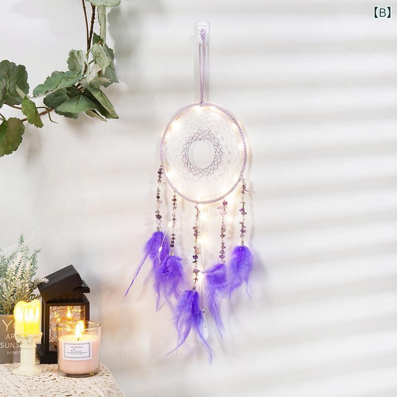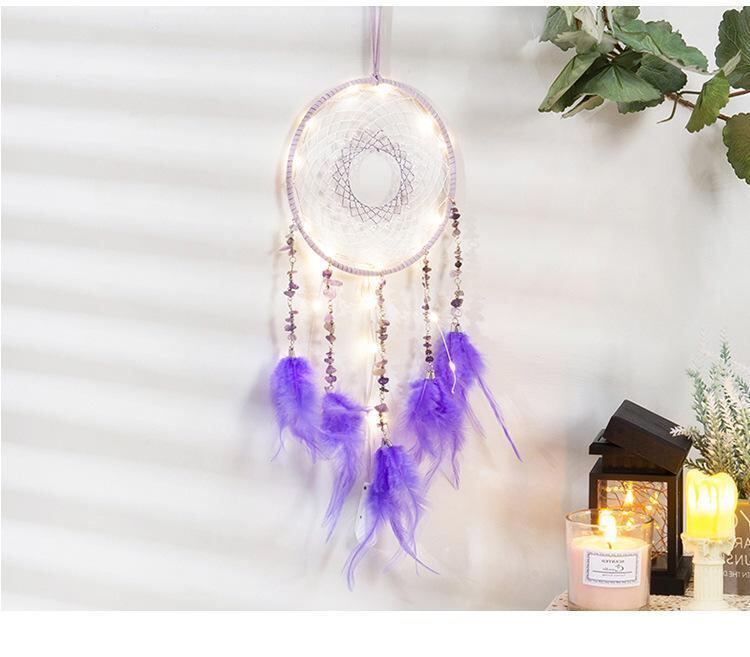 ドリームキャッチャー さざれ石 天然石 紫水晶 アメジスト インテリア 窓飾り 壁掛け 吊り下げ オーナメント 魔除け お守り おしゃれ アメリカン ボヘミアン スタイル LEDライト付き イルミネーション 部屋装飾 ハンドメイド パープル | cybercart