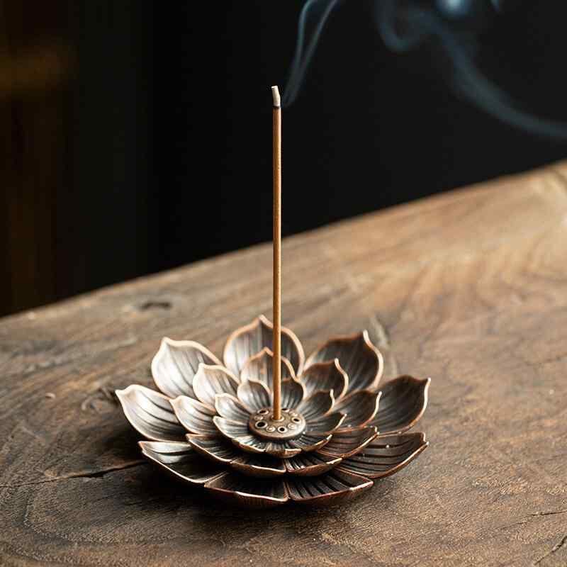 香炉 蓮 線香立て 多孔式 自立型 白檀 線香用 お香立て 家庭用 室内 リビング 玄関 茶道 瞑想 リラックス 香座 香皿 香台 置物 オブジェ 禅風 和風 レトロ アンティーク調 合金製 メッキ加工 | cybercart
