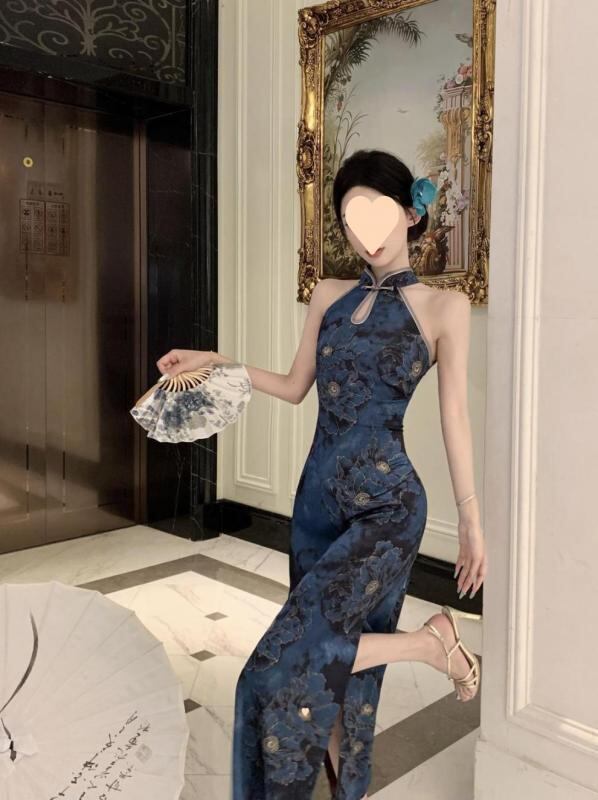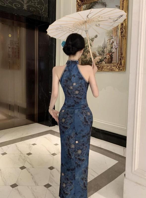 ワンピース レディース 大きいサイズ 新チャイナ風 改良チャイナドレス オフショルダー 花柄プリント ウエストマーク ロング丈 ポリエステル 体型カバー パーティー ドレス ブルー
