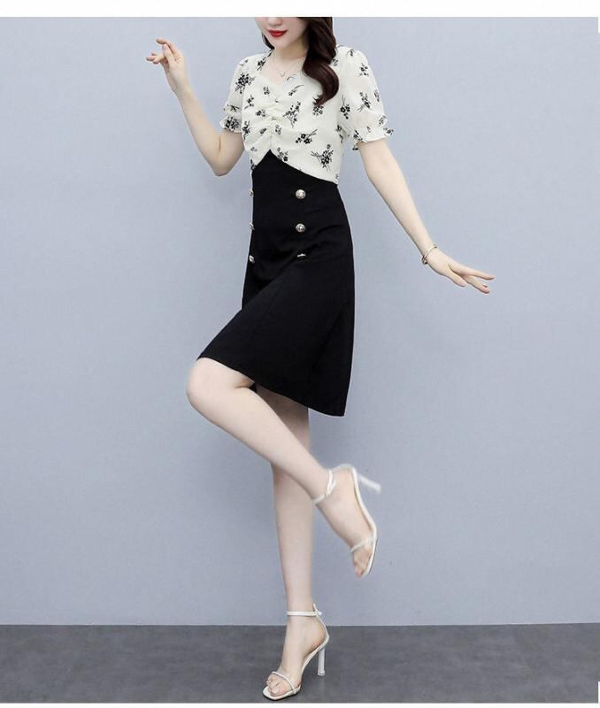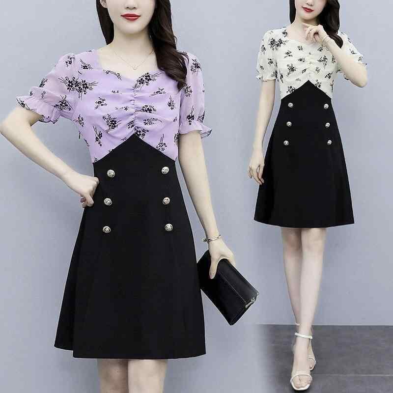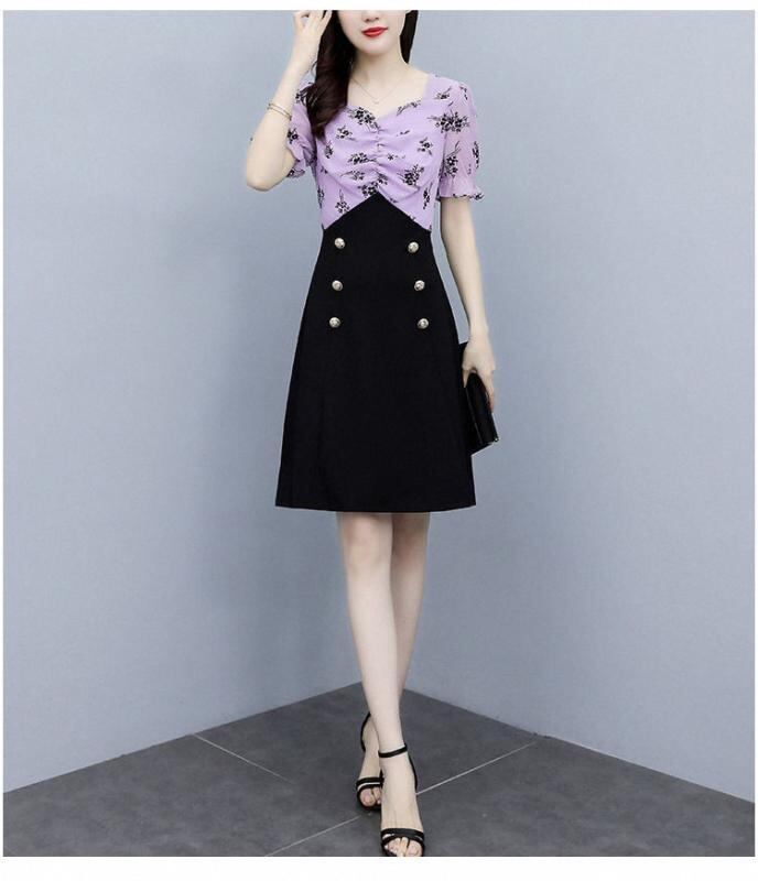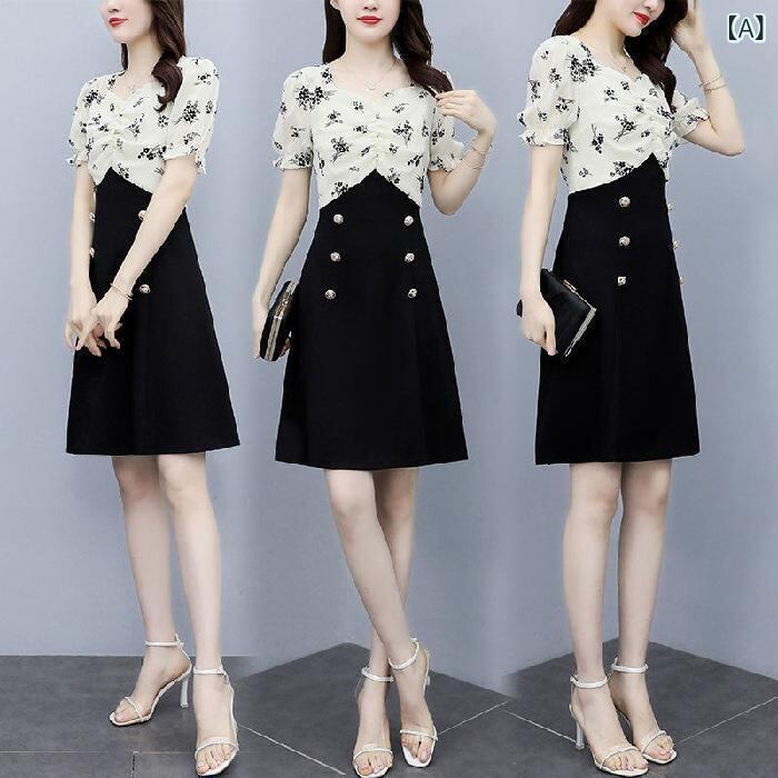 ワンピース レディース 夏 サマー 半袖 ゆったりサイズ 雪柄 花柄 修身 ミドル丈スカート Aライン方領 パフスリーブ 高腰 民族風