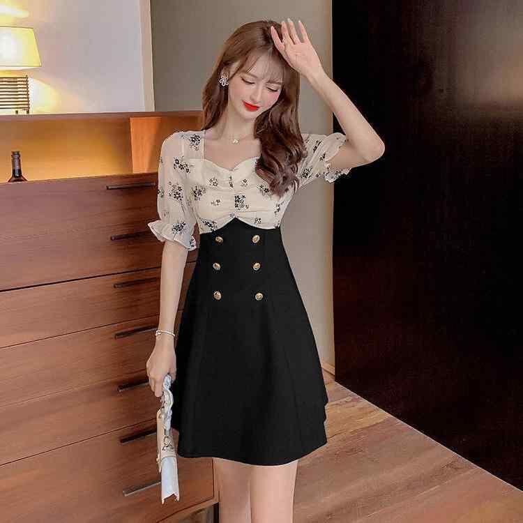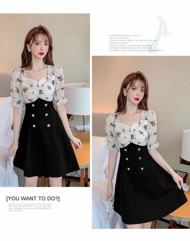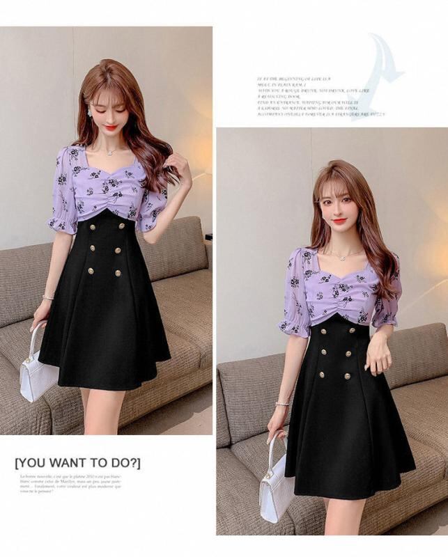 ワンピース レディース Aライン 方領 半袖 絞り染め パフスリーブ ハイウエスト ポリエステル素材 上品 エレガント フェミニン 復古風