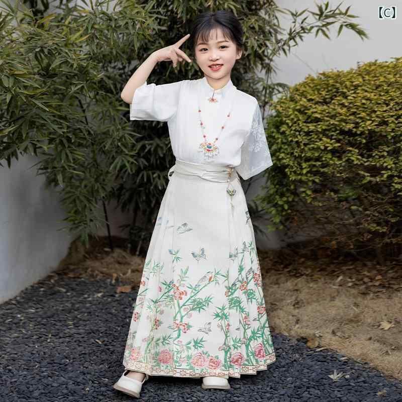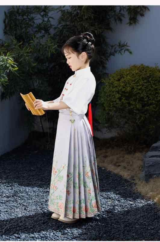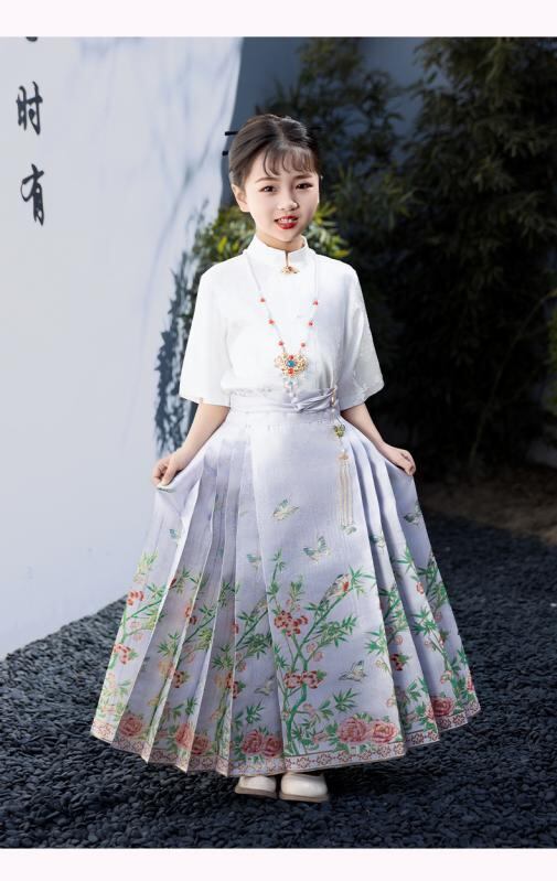 漢服 キッズ 女の子 子供 小学生 馬面裙 中国伝統衣装 伝統スカート スクール 舞台衣装 発表会 織金 金糸織り シェニール スパンデックス トリアセテート ホワイト ピンク グレーパープル