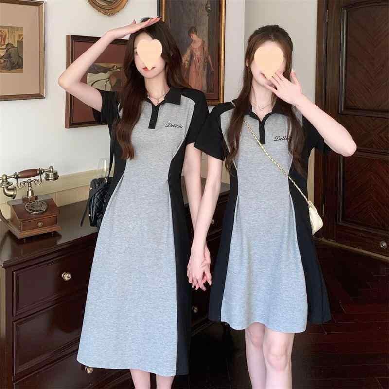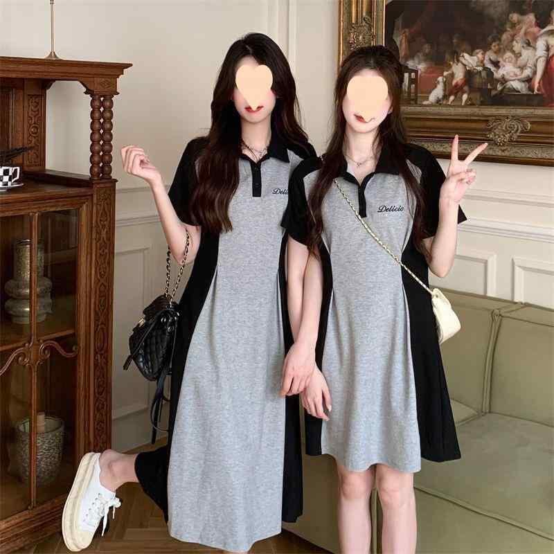 ワンピース レディース 大きいサイズ 半袖 Tシャツワンピース 綿 コットン 異素材切り替え ポロ襟 ウエストマーク Aライン 細見え 着痩せ 体型カバー ミディ丈 カジュアル ストリートスタイル 大人可愛い グレー ブラック チェック柄