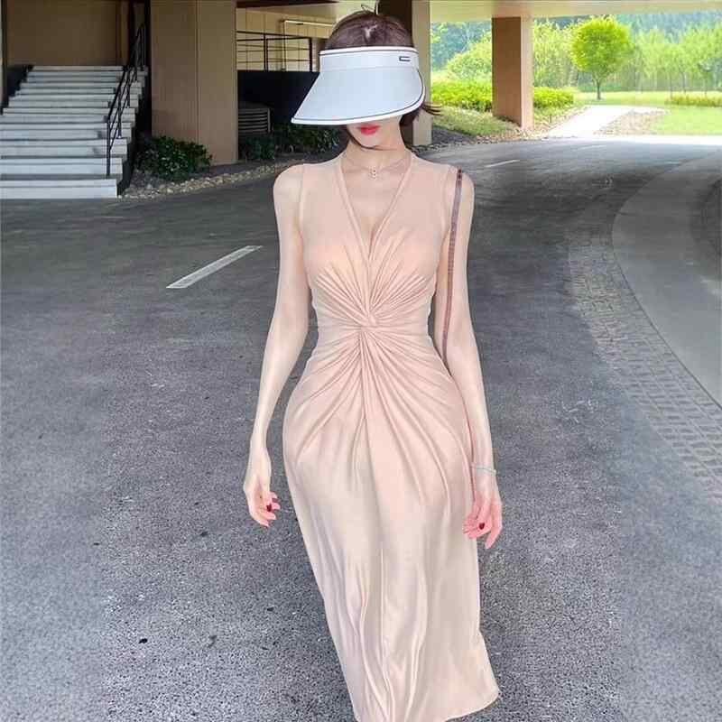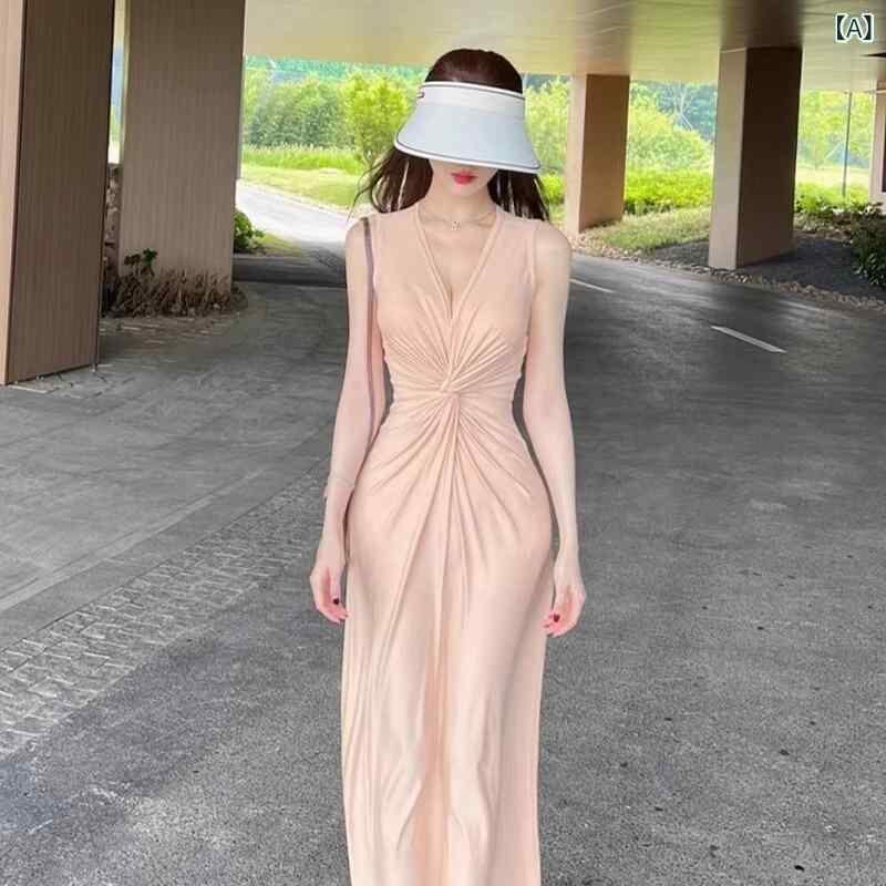 ワンピース レディース Vネック ノースリーブ ツイストデザイン ギャザー ウエストマーク ハイウエスト 体型カバー スタイルアップ 細見え ロング丈 タイト フェミニン エレガント ポリエステル くすみピンク