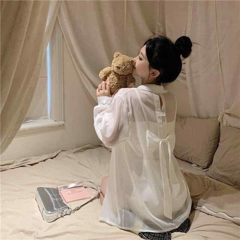 シャツカーディガン レディース 夏用 デザイン リボン バックオープン シフォン 薄手 シアー 接触冷感 UV対策 長袖 ゆったり ポリエステル ポロ襟 きれいめ 前開き