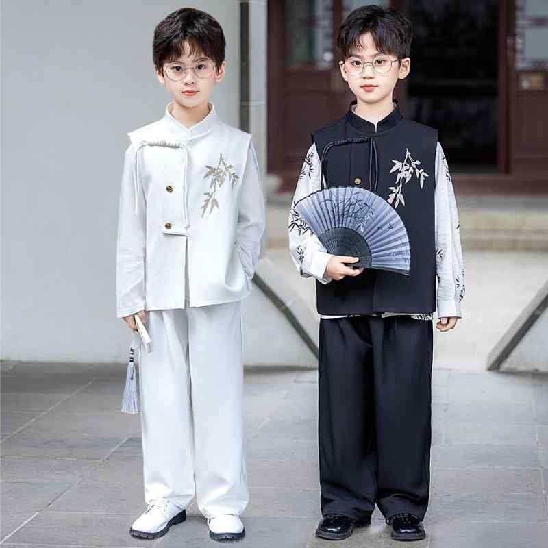 漢服 男の子 子供服 セットアップ 唐装 新中華風 中国風 刺繡 ベスト ジレ 長袖シャツ 長ズボン 三点セット ポリエステル製 ソフトな肌触り カジュアル おしゃれ 発表会 舞台 衣装 イベント 普段使い