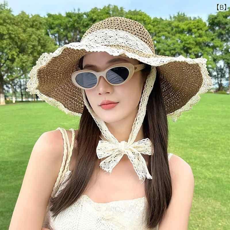 麦わら帽子 レディース リボン付き 透かし編み レース縁 綿素材 つば広 UVカット 日よけ 上品 ビーチ リゾート 旅行 夏 お出かけ