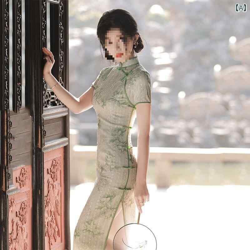 チャイナドレス レディース ワンピース モダンデザイン ミディ丈 ノースリーブ ポロ襟 レトロ 民国風 山茶花柄 ハイウエストスリット 夏物 エレガント 上品 フェミニン グリーン スパンデックス 伸縮性 デート パーティー