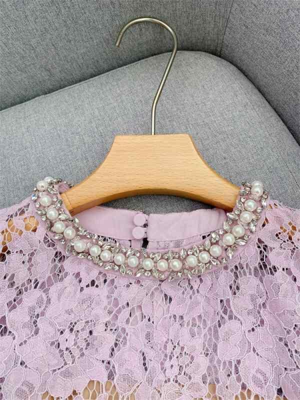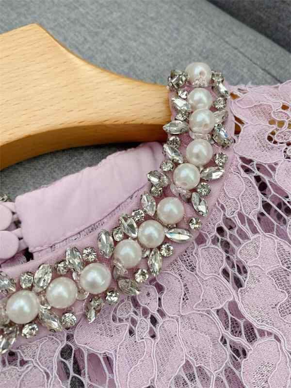 ワンピース レディース 高級感 エレガント フォーマルドレス ラウンドネック レース フラワー シースルー ビジュー パール 半袖 ハイウエスト スリムフィット ミディ丈 ラベンダー