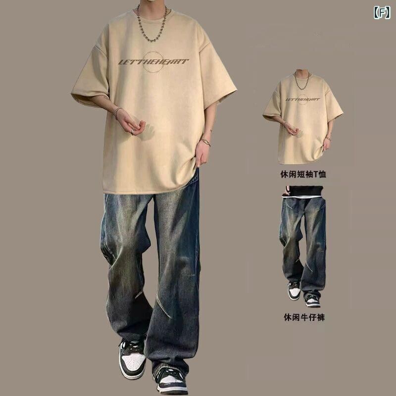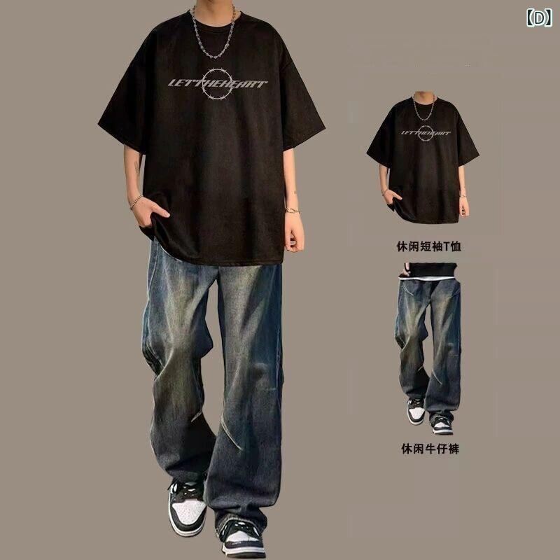 メンズ カジュアル セットアップ 半袖 Tシャツ デニムパンツ 夏 薄手 ゆったり ストリートファッション クール 上下セット コットン 綿素材 ルーズフィット 普段使い タウンユース リラックスウェア
