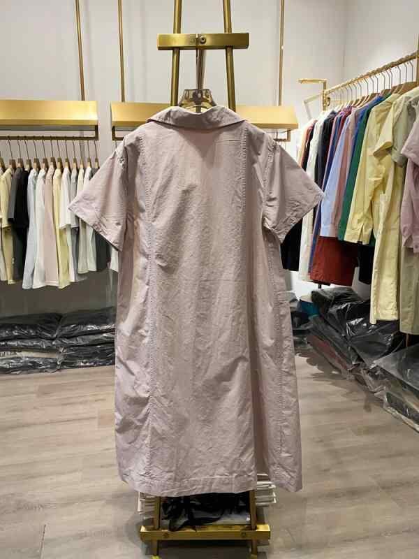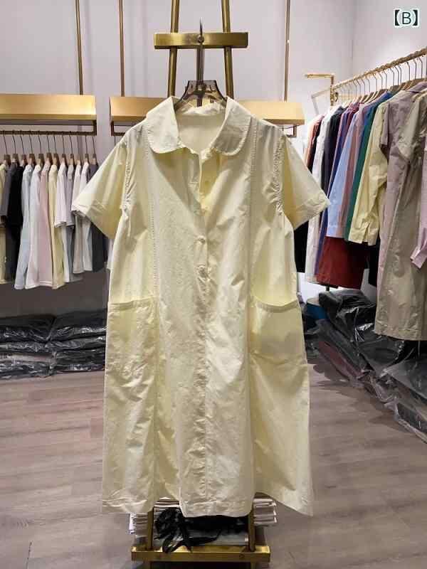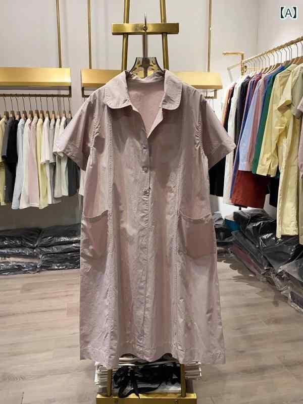 ワンピース レディース 半袖 襟付き ハーフオープン コットン 綿 レトロ シンプル ゆったり 着痩せ Aライン ミディ丈 カジュアル デイリー 普段使い ピンク アプリコット グリーン