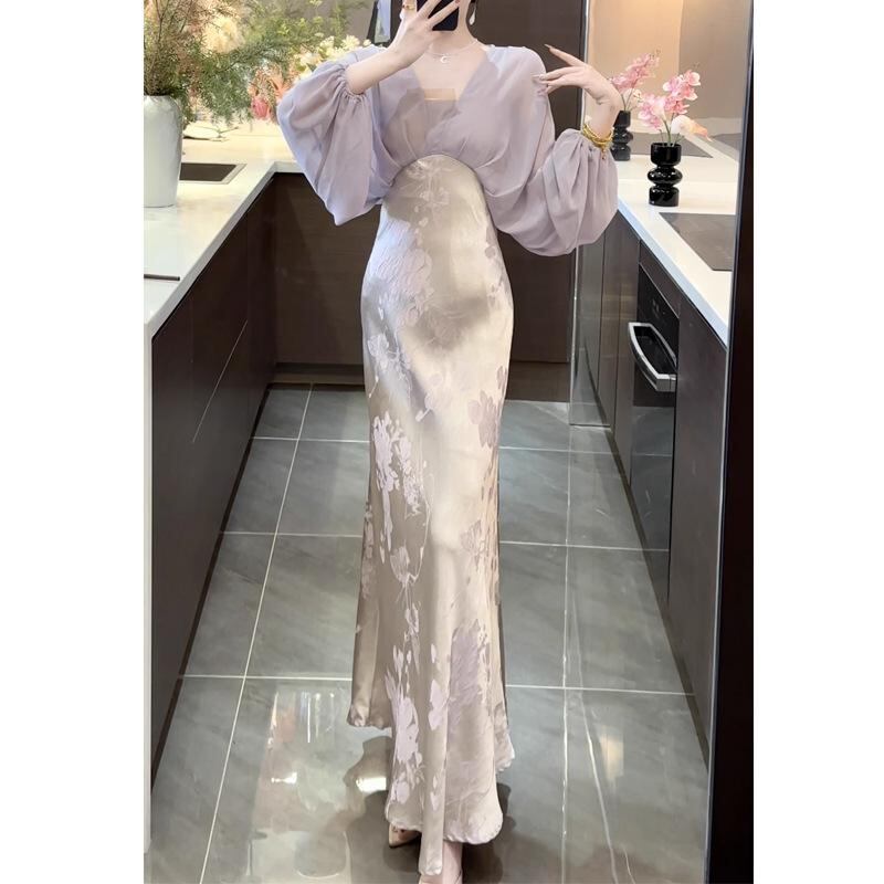 ワンピース レディース 女性用 中華風 ネオチャイニーズ レトロモダン フェイクツーピース 重ね着風 配色 切り替え バイカラー ジャガード織り 植物花柄 サテン地 光沢感 Vネック 長袖 ハイウエスト ロング丈 エレガント 上品