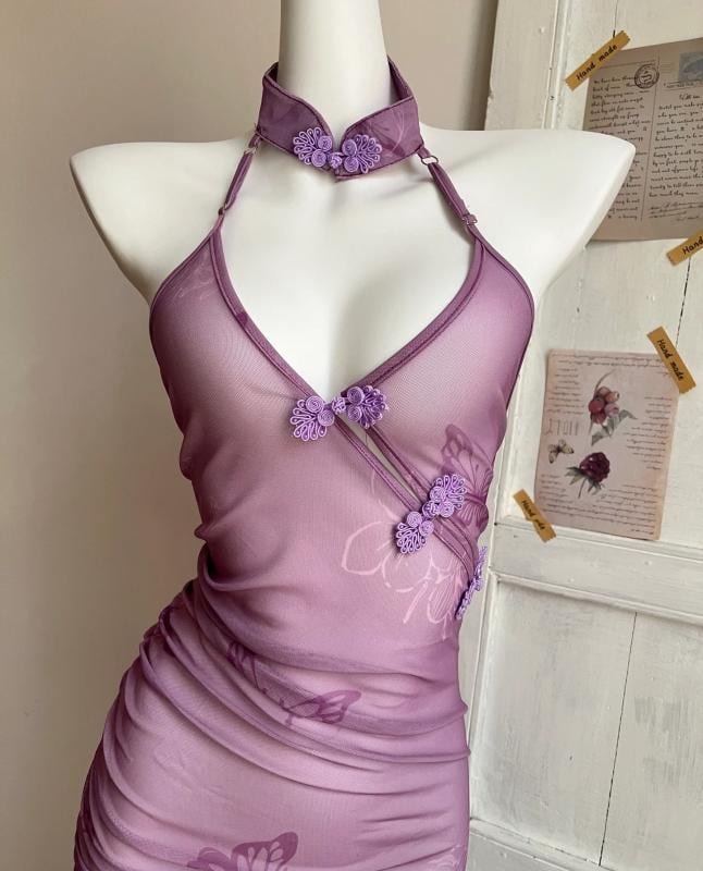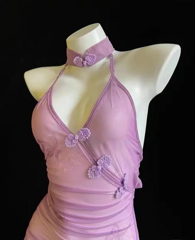 ランジェリー レディース 女性用 セクシー チャイナドレス 旗袍 小胸 誘惑 ナイトウェア ルームウェア シースルー メッシュ素材 パープル コスプレ衣装 デート服 記念日 特別な夜