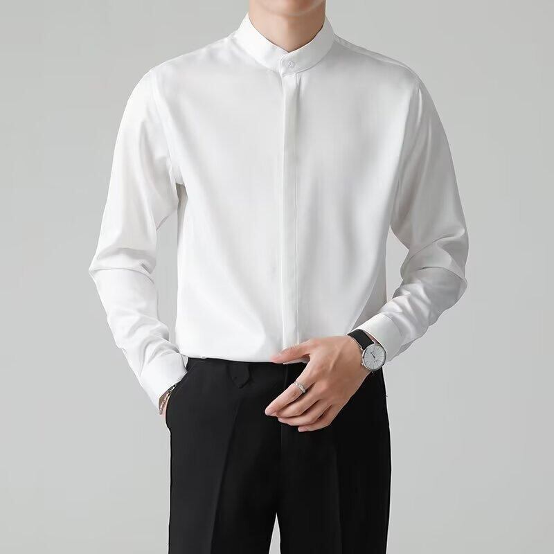 シャツ メンズ スタンドカラー 長袖 ゆったり ルーズフィット ドレープ感 ポリエステル 韓国風 カジュアル トレンド スタイリッシュ デザイン 春秋 普段使い 無地 シワになりにくい