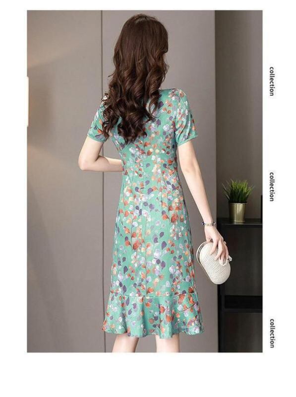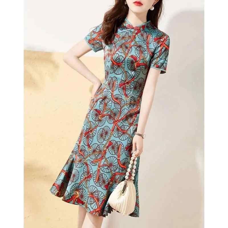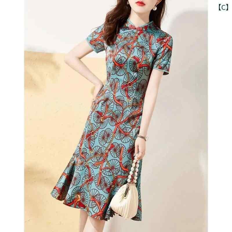 ワンピース レディース 大きいサイズ 改良旗袍 チャイナドレス 中国風 レトロ ヴィンテージ エレガント 花柄 着痩せ 体型カバー ミモレ丈 Aライン 半袖 スタンドカラー ネイビー グリーン ブルー
