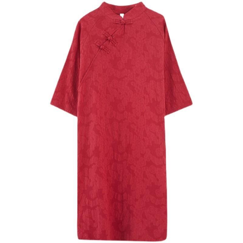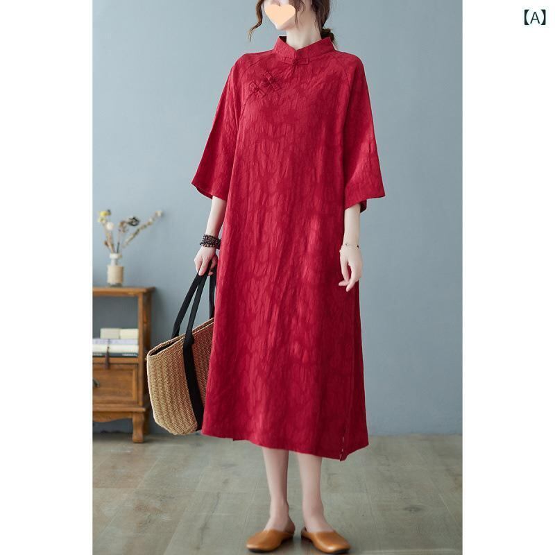 ワンピース 大きいサイズ ゆったり リラックスフィット 綿麻 素材 ジャカード織り 無地 文芸風 レトロ 禅意 民族風 改良チャイナドレス Aライン ロング丈 マキシ丈 スタンドカラー 長袖
