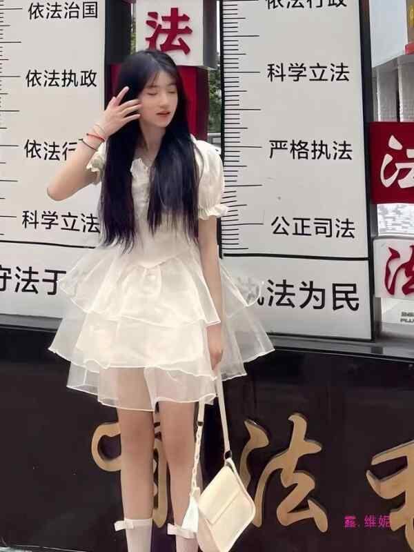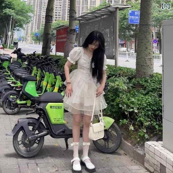 ワンピース レディース 韓国 おしゃれ スリム 着痩せ パフスリーブ リボン お姫様風 メッシュ チュール ボリュームスカート ショート丈 アプリコット