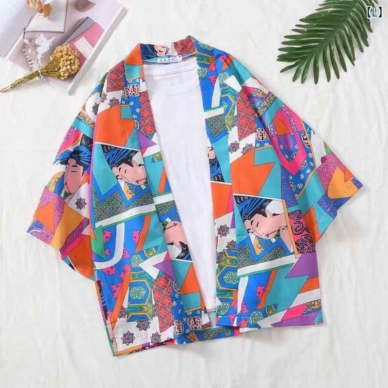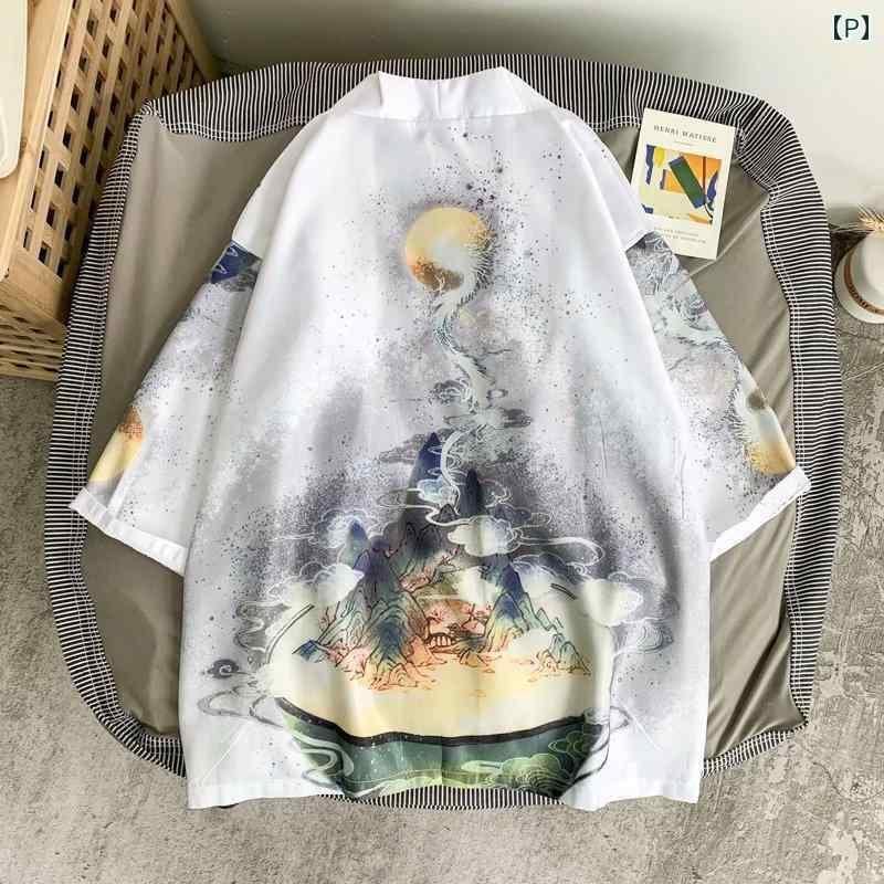 羽織 メンズ 男性用 中国風 ドラゴン柄 七分袖 プリント 開襟シャツ風 ルーズフィット ポリエステル素材 カジュアルスタイル 普段使い 部屋着 軽量 通気性