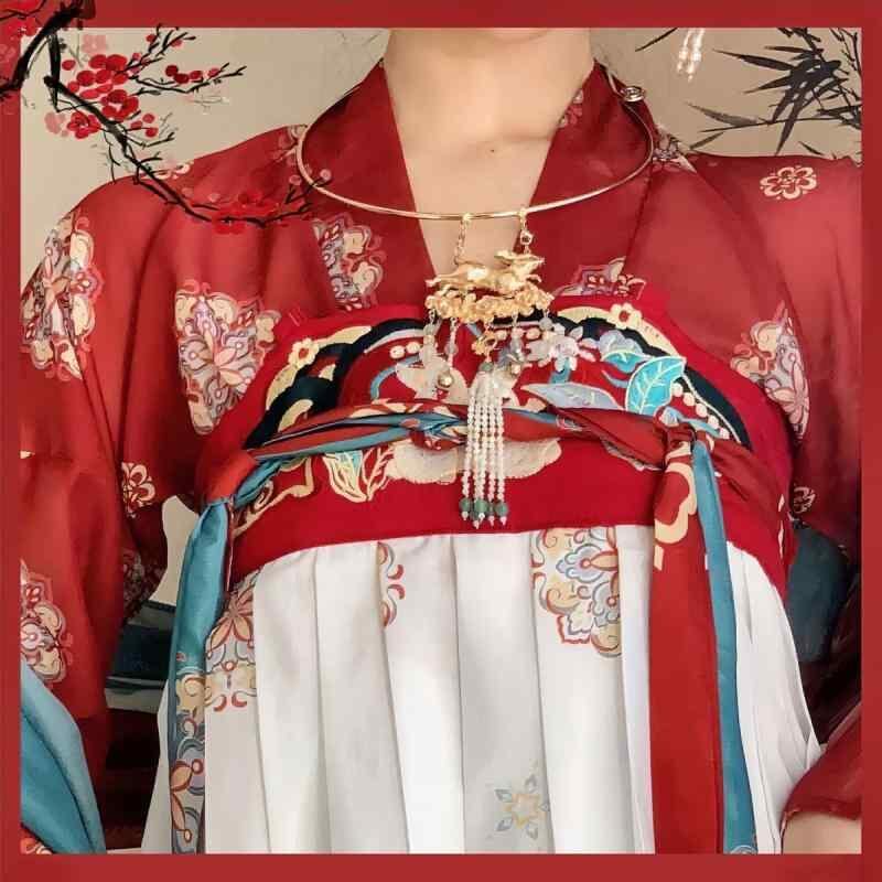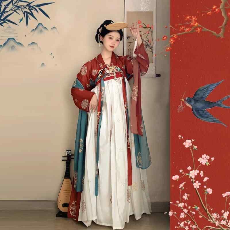 漢服 レディース 春秋 唐装 斉胸襦裙 中国伝統衣装 紗生地 柔らか素材 肌触り良い 快適な着心地 フルセット お揃い 親友コーデ 刺繡デザイン イベント 舞台衣装