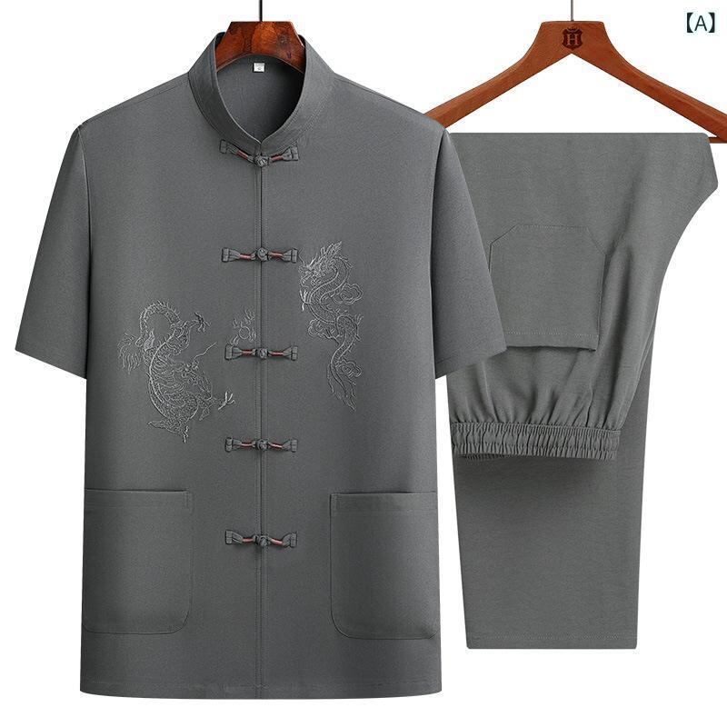 唐装 メンズ 中高年 男性用 半袖 セットアップ 上下セット 中国風 中華服 夏用 ポリエステル 刺繍 ボタン飾り 普段着 カジュアル ダークグレー ライトグレー レッド ネイビー